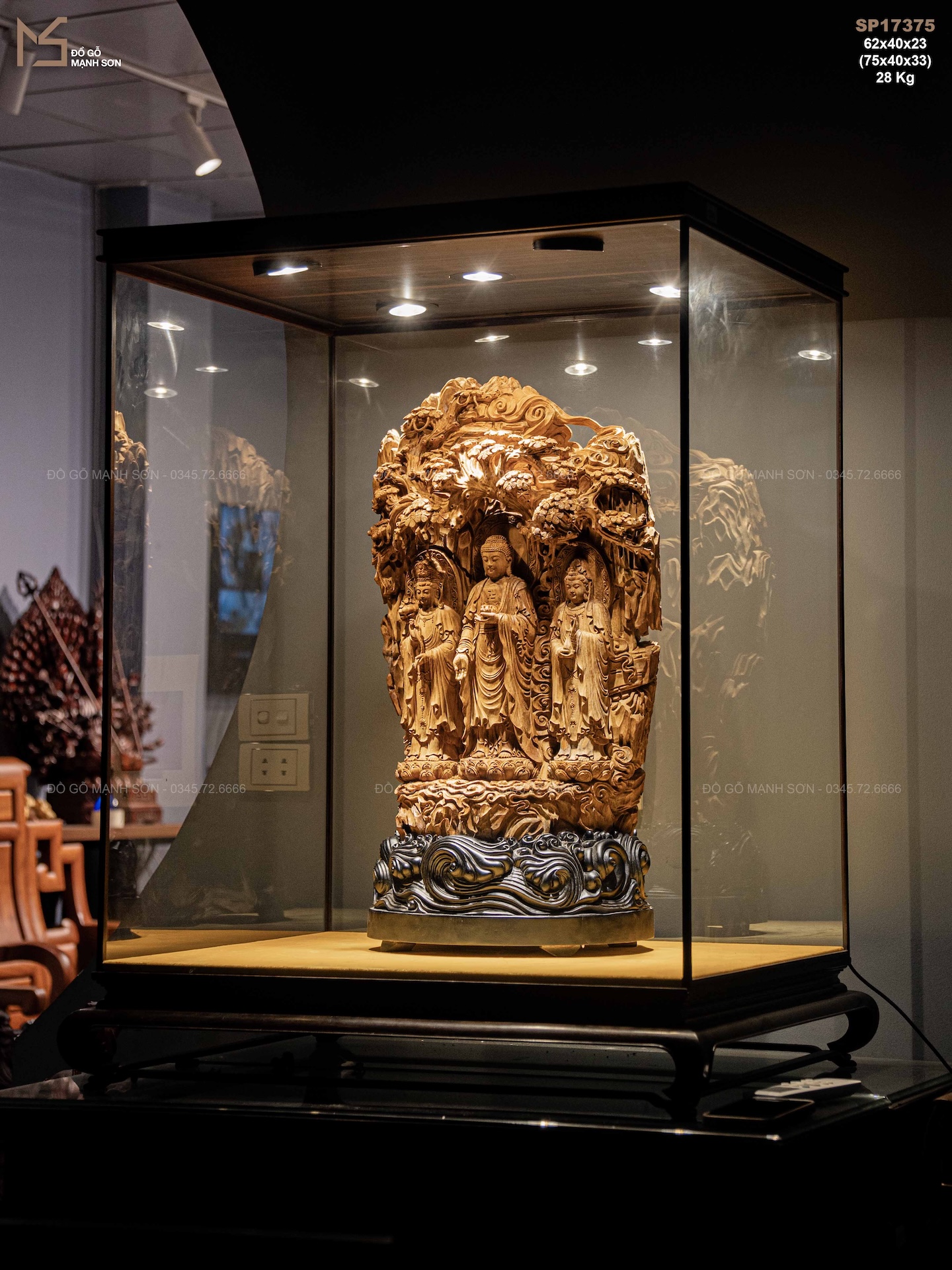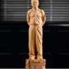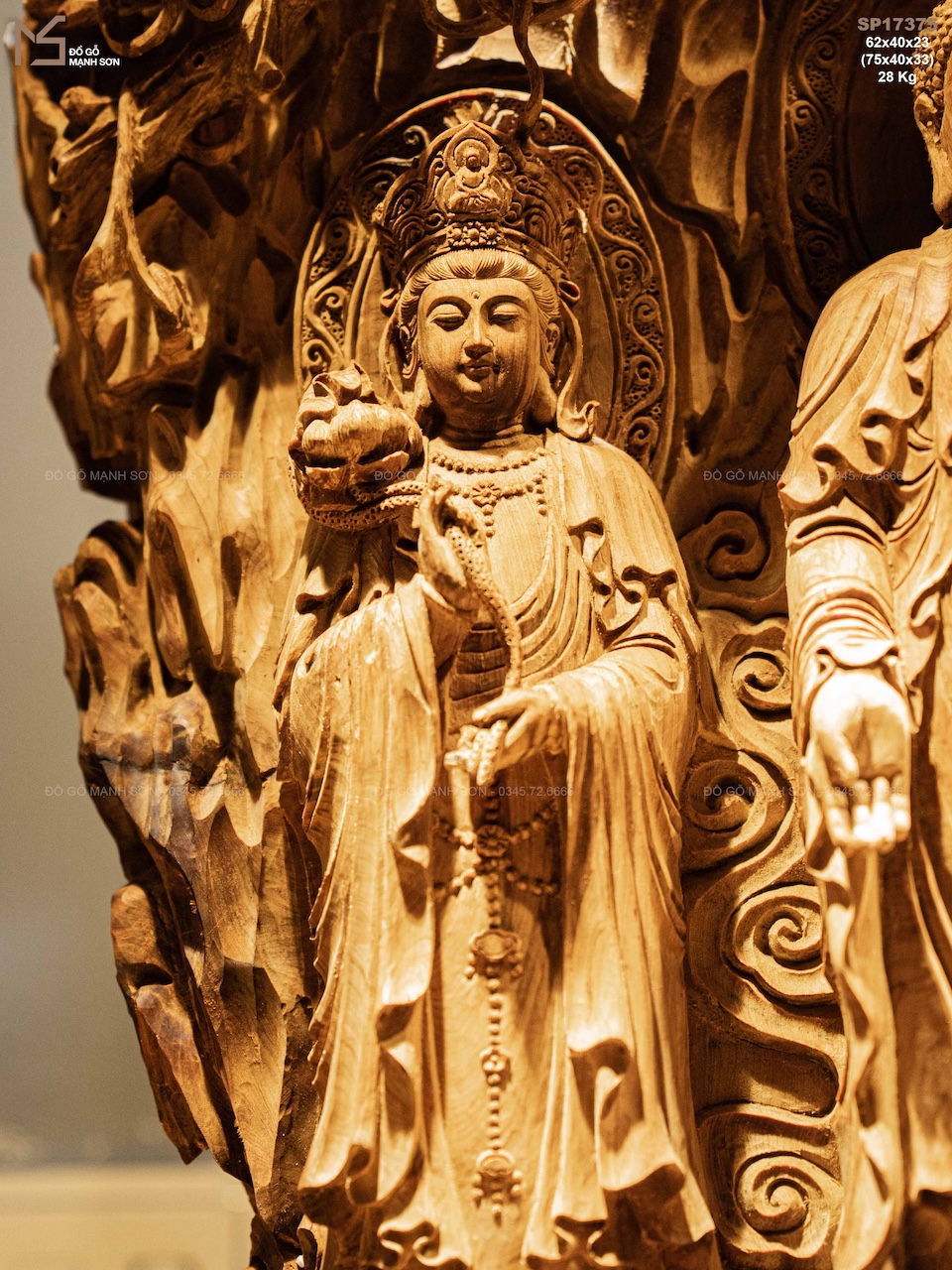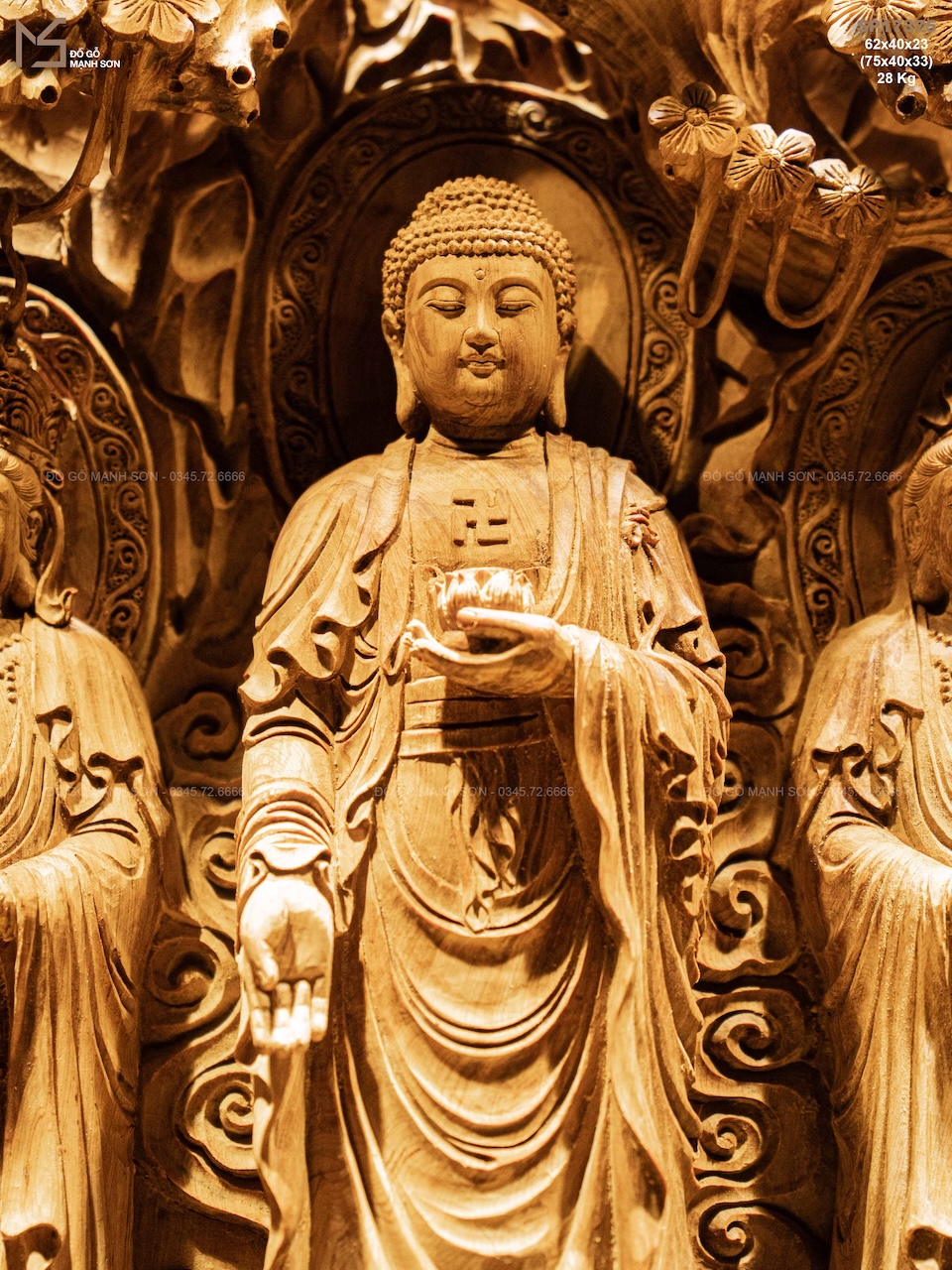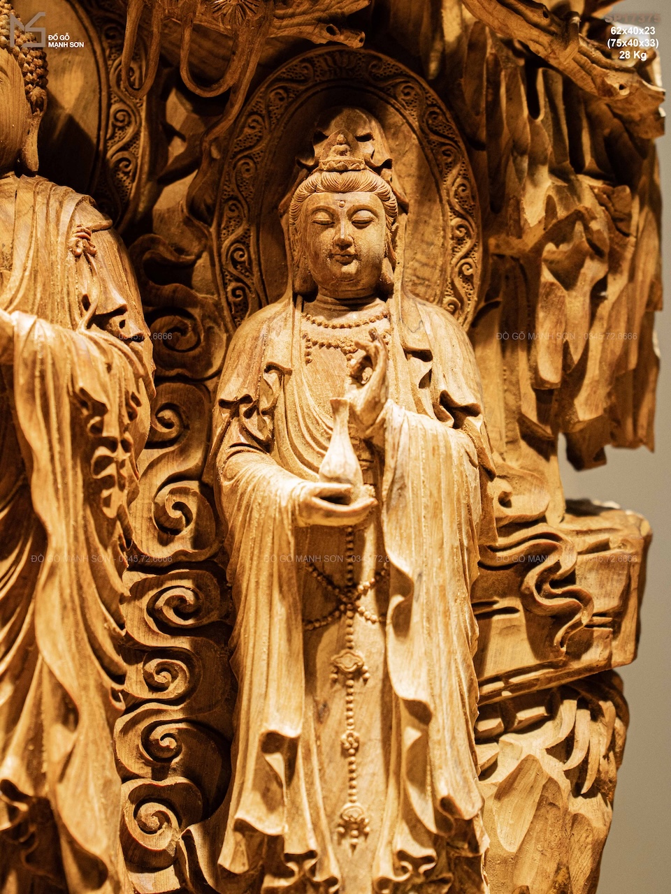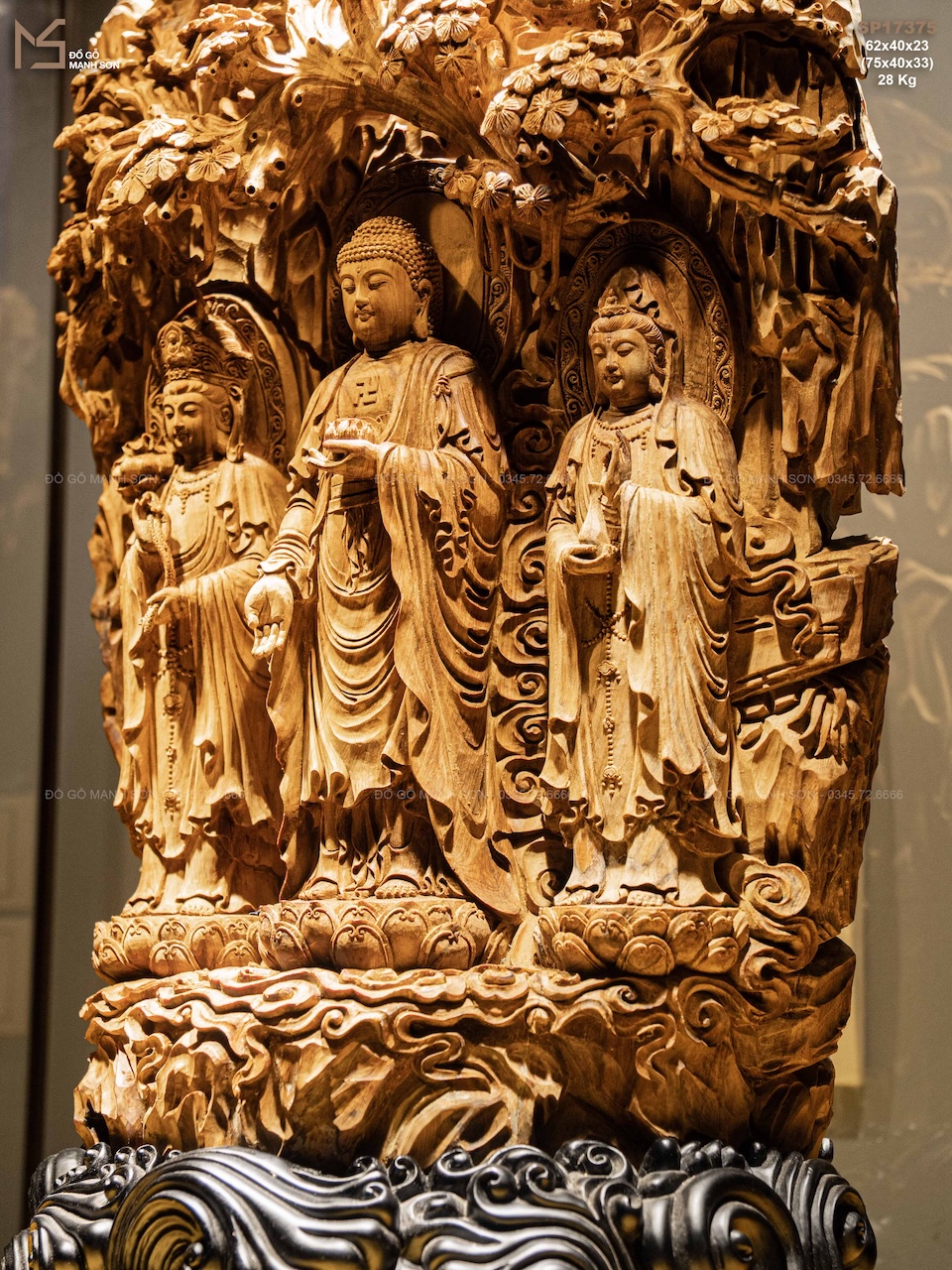 Điểm đặc biệt nằm ở chất liệu gỗ hoàng đàn lâu năm — dòng gỗ quý có sắc vàng sáng thanh nhã, thơm nhẹ tự nhiên, càng để lâu càng đượm. Gỗ mềm nhưng chắc, lên chi tiết rất bén, giúp nghệ nhân thể hiện được thần thái sâu sắc của từng vị trong bộ Tam Thanh.